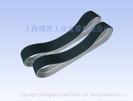 POWERCHEM传动带,上海博凯工业皮带有限公司生产大量同步带常见型号有:公制的T10,T5, AT5,AT10,英制的L,H,XL,XH,圆弧齿的3M,5M,8M,14M.双面齿的DT10,DT5等。可以根据客 户要求对聚氨酯同步带进行加工处理比如可以再齿背或齿面上加布,加红胶,黄胶,黑胶, 白胶,硅胶,PVC(爬坡带),加挡块,打孔等作业。POWERCHEM传动带库存充足,质量一流, 服务周到,价格公道客户可以根据自己的需要采购不同长度的带子,如有需要请找上海博凯 工业皮带有限公司,谢谢。