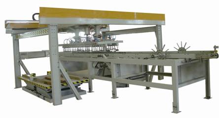 产品说明:用途:适用于强化地板、实木复合地板、刨花板、中密度板等木制品行业的自动上料。主要部件功能: 1.带动力输送线:将半成品的整垛地板自动送到液压升降台上 2.液压升降台:配合真空吸盘每移走一层地板自动上升一块板厚的高度 3.真空吸盘自动上料系统:自动将多片地板一次性平移到横向进料输送线上 4.横向进料输送线:利用两段输送线不同的速度将每片地板拉开一定距离并自动送到纵向进料输送线上 5.纵向进料输送线:将地板自动分离后送到纵向开槽机加工成成