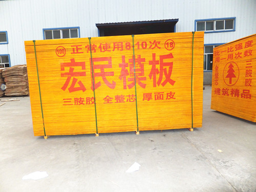产品说明:我公司建筑模板全部采用 加强型三胺胶 厚面皮 全整芯高层专用 反复使用8-12次,产品严格按照行业标准生产(GB/18580-2006),并且我公司生产的“宏民牌” 建筑模板已通过ISO9001-2000 国际质量管理体系认证,其性能在国内同类产品中处于领先水平,拥有国内先进的多层板生产流水线12条,科技研究线3条,年加工单板220万张。公司产品畅销全国各地,深受各地客商和建筑公司的喜爱和好评!“靠质量开拓市场,靠信誉赢得市场”是公司的企业宗旨。江苏沭阳县宏民木业有限公司紧跟时代的步伐,着眼未来,产品不断追求卓越,以优质的建筑模板,回报用户。产品规格有:4*8尺(1.22m*2.44m*1.1cm-1.8cm)3*6尺1.8m*91.5cm*1.1cm-1.8cm)公司坚持以优质的产品、良好的信誉做好市场。以“开拓、诚信、务实、创新”的精神为宗旨,抓管理、练内功,走出一条竞争求发展的创业之路。我公司交通便利,区位优势明显,傍依205国道、宁连高速、京沪高速,产品远销上海、山东、 湖南、浙江、安徽、陕西、东北三省等.