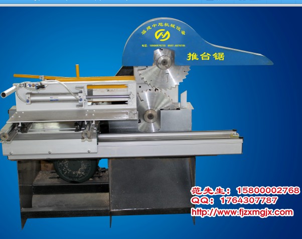 产品说明:精密推台锯简易推台锯木工推台锯圆木推台锯 http://www.fjzxmgjx.com/ 推台锯型号: MGJT 400 锯销长度:50cm-200cm 加工直径:20cm-40cm(可定制)主电机功率:11千瓦×1台送料速度:10米 (人工) 锯片规格: 450×4.0×60×40T (加工口径40cm) 冷却方式:无需冷却 (可安装) 外形尺寸:350cm×200cm×160cm 设备性能:新型推台锯;安全性强;锯销面光滑平整,适合短料硬杂木、大口径圆木加工。规格可调节!设备特点: 一:使用小功率电机做动力,节约能耗,并使用气动装置夹紧木材,快速灵活,安全可靠。 二:采用高精密直线轴做轨道使用轻便灵活,大大降低了生产者的劳动强度。 三:采用大尺寸超薄锯片,无需冷却,可加工出的产品光滑、标准、不需经过刨床等设备的两次加工,可完全淘汰带锯机。精密推台锯简易推台锯木工推台锯圆木推台锯