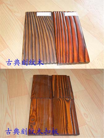 古典刻纹木:厚15mm,21mm,28mm,95mm,145mm,宽95mm,145mm,长3000mm,4000mm 古典刻纹木扣板:厚12mm,15mm,宽95mm,长4000mm