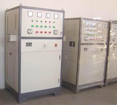 产品说明:高频发生器又称高周波是介质加热的核心设备。利用380V、50Hz三相交流电源,设备可产生6.78MHz、13.56MHz或27.12MHz的高频振荡,经过输出匹配网络将大功率高频电场施加到工件上(如待加热的层压胶合弯曲木板、集成材等),高频电场穿透介质,有选择地只作用于工件中的胶分子,利用介质分子在高频电磁场作用下高速摩擦产生热量的原理。 高频介质加热属于直接加热,与传统的传导加热方式相比具有很多优点: 加热速度与材料的热传导能力无关,通电就热、断电就停,因此加热速度极快而且过程容易控制; 加热均匀。采用高频加热,由于电磁场的穿透能力强,可以使电场均匀地作 用到物体的整个部位,从而使物体各部分被均匀加热。 具有一定的选择性。由于不同物体的介质损耗不同,如果我们按照一定的规则选择频率和排列物体,就可以有针对性地对处在同电场之中的某一种物质进行加热(如木材胶合,我们可以使木材本身基本不热,仅胶剂加热固化)。 ☆有利于实现自动化,可进行工业化生产,改善作业环境,减轻劳动强度。