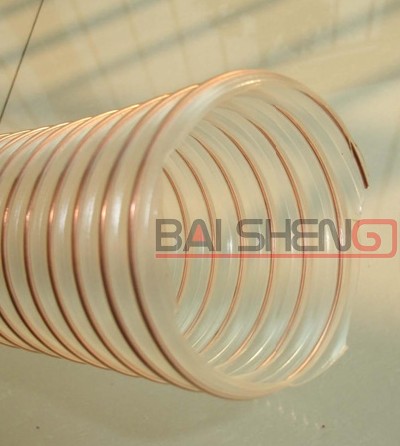 产品说明:产品特性:超轻型,无毒无味,可任意弯曲、可压缩,压缩比达4:1. 管壁采用德国进口PU材质内嵌镀铜螺旋钢丝加工制成,管壁厚度为0.4mm。软管采用特殊结构,弯曲或压缩后内壁规整,不会产生折叠硬角,以使通风或输送物料时阻力大大减小,也大大增加了软管的使用寿命。