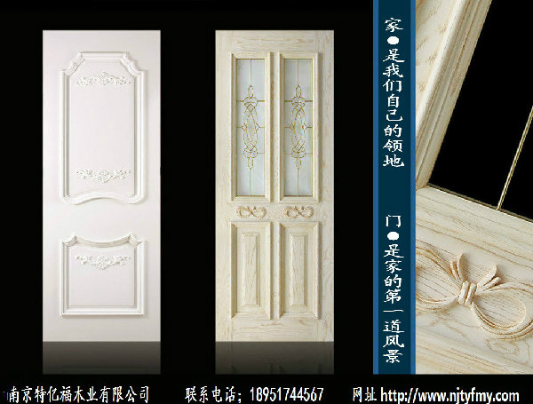 产品说明:南京特亿福木门,南京木门,南京木饰面,南京酒店家具,南京原木门是由南京特亿福木业有限公司精心制作的产品。联系人:王小姐 联系电话;南京特亿福木门,规格2000×800 , 价格880元/套 ,包含木门,门套,油漆,安装,运输。南京特亿福烤漆木门的特点: 1、表面颜色:烤漆木门表面颜色是使用您喜欢的油漆颜色 2、门扇厚度:烤漆木门是4.5公分 3、门框厚度:烤漆木门是4公分厚,中间为实芯,并且小侧面有插槽配合门套线用的 4、门套线:烤漆木门为实木7字形 I、门扇:中间用子接杉木做好长方形框架,中间是加高密度板做筋骨支架,两面使用整块高密度板(高密度板烤漆实木门为9毫米)然后通过电脑雕花机雕刻花纹,然后再打磨、制作表面颜色,烤漆木门是整体油漆做面收边! II、门框:烤漆木门门框是使用整块子接杉木做底板,上面加高密度板做成Z字形实芯门框,小侧面带插槽,表面颜色用油漆做成 烤漆木门基材为密度板,表面经过八次喷烤进口漆(三底、三面、二光)高温烤制而成一种工艺,即喷漆后经过进烘房加温干燥的油