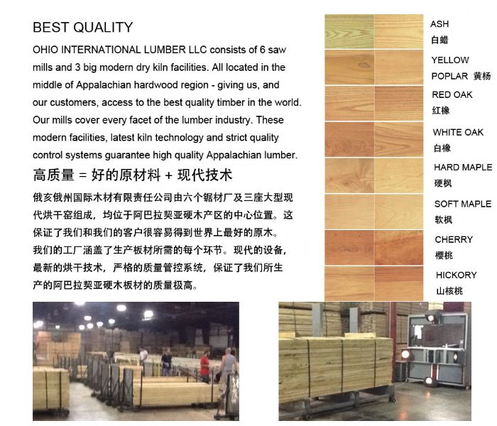 产品说明:OHIO INTERNATIONAL LUMBER LLC 俄亥俄州国际木材有限责任公司 OHIO INTERNATIONAL LUMBER LLC has been in the business for over 60 years. For over 60 years, OHIO INTERNATIONAL LUMBER LLC has been staffed with a very experienced team. Excellent integrity, good quality, modern kiln equipment, in time delivery - all are qualities for which now OHIO INTERNATIONAL LUMBER LLC quickly became known. Now we come to China and will supply better product and service to this big market. 俄亥俄州国际木材有限责任公司已成立60余年。在过去的60年里,我们建立了一支由专业人才构成的团队。诚信经营,高质量的产品,现代的烘干窑,及时的发货,这些优秀的品质为我们在国际及国内市场赢得了极高的声誉。现在我们来到中国,我们将会为这个极具潜力的市场,提供更好的产品以及服务。 COMPETITIVE PRICES All our lumber, 100% north America Appalachian hardwoods, is harvested and manufactured by OHIO INTERNATIONAL LUMBER LLC. In other words, you will get the lumber without any trading companies or agents. This guarantees our customers having the most competitive prices. 极具竞争力的价格俄亥俄州国际木材有限责任公司所生产的硬木板材,其所需的原木100%来自于美国北部的阿巴拉契亚山脉,且从砍伐、锯材到烘干,完全由我们本公司独立完成。换句话说,您所买到的板材直接来自于生产厂家,未经任何贸易公司或代理,这就保证了您可以得到最具竞争力的价格。 BEST QUALITY = Best Raw Material + Modern Technology There is another standard which OHIO INTERNATIONAL LUMBER LLC is proud - all our mills are located within a 150 mile radius of our corporate headquarter in Ohio. This area is right in the middle of Appalachian hardwood region - giving us, and our customers, access to the best quality timber in the world. OHIO INTERNATIONAL LUMBER LLC consists of 6 saw mills and 3 big modern dry kiln facilities. These divisions cover every facet of the lumber industry. These modern facilities, latest kiln technology and strict quality control systems guarantee high quality Appalachian lumber. 极高的质量 = 最好的原材料 + 现代技术俄亥俄州国际木材有限责任公司值得骄傲的另一点是 – 我们所有的锯材厂、烘干窑,均分布在位于俄亥俄的总部方圆150英里范围内,这片区域正处于阿巴拉契亚硬木产区的中心位置。这就保证了我们和我们的客户很容易得到世界上最好的原木。俄亥俄州国际木材有限责任公司由六个锯材厂及三座大型现代烘干窑组成。我们所有分厂的运营涵盖了生产板材所需的每个环节。现代的设备,最新的烘干技术,严格的质量管控系统,保证了我们所生产的阿巴拉契亚硬木板材的质量极高。 QUICK SHIPPING Our saw mills and dry kiln facilities have a monthly production of 1.6 million board feet (4000 M3) and 10 million board feet (24000 M3) in stock. Big volume production and stock assure consistently and quickly supply to our customers world wide. 快速发货俄亥俄州国际木材有限责任公司所有的锯材厂和烘干窑,月产量达8000立方,日常库存量维持在48,000立方。高产量、高库存保证了我们有能力持续的将产品迅速的发到您的仓库。 We are very confident that you will be pleased with our product and would like to invite you to take a look at our website: www.ohiointernationallumber.com or our Chinese version web at Alibaba www.ohiohardwoodlumber.com. 我们对于自身产品的质量、价格、发货速度以及服务都非常有信心,特邀您浏览我们的网站以获取更多信息 汉语版网站也已开通,网址是 We look forward to doing business with you! 俄亥俄州国际木材有限责任公司真诚期待同您的合作!