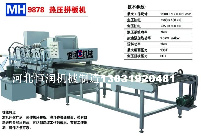热压机性能特点:本机用途广泛,可做热压拼板,也可做普通贴面。带有自动进料台和出料台。可达到连续工作的效果。节省工作周期,操作简便可靠。
