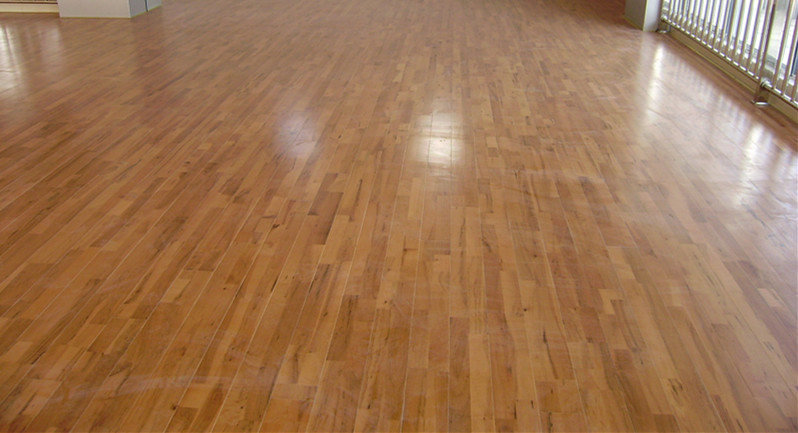 单从外表来看,只能看到运动木地板的面板,且这个面板是经过处理过的,此时甚至很难辨认出面板的等级是一级枫木还是二级枫木,当然材质的话可以通过颜色深度看出,枫木是属于浅色系的,其它诸如橡木、柞木颜色都较深。面板除了经过前期的处理,安装完成后还会进行一定的修整,上漆。所使用的漆一定要是运动地板专用的地板漆,该漆表现的特点是在涂上后会对木地板颜色有所加深,但对木地板纹理的纹路不会有太大影响,且最重要的是,它不仅能美化木地板纹理,使之变得光亮,而且具有防滑效果,所以验收时一定要亲自体验一下。