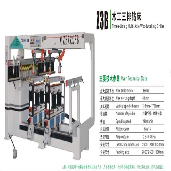本机器适用于木料板材加工(钻孔)之机器。排钻采用整体框架结构,横梁、立柱和台面采用优质铸铁加工而成,这样机器更稳定!整机采用先进的加工及技术工艺,使机器运行更加稳定,操作简单,调整方便。