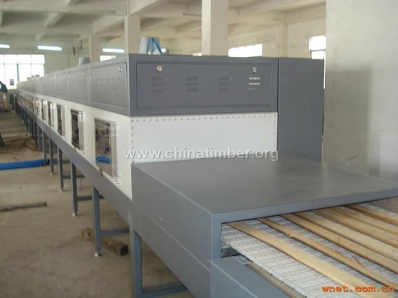 产品说明:木皮微波烘干机由于在常规干燥中,因变形、开裂、霉烂等原因造成大量的浪费;而微波干燥机具有加热均匀、干燥速度快、不走形、不开裂、防蛀防霉、产品质量好,有利于连续化和自动化生产等一系列优点。木材微波干燥与众不同的特点是热量不是物体外表传入,而是微波透过物料内部被所含的水份和木材本身吸收直接加热。由于物料的表面水份的蒸发,因此,物料内部温度高于表面。使物料内部形成向外的压力差,加速了水份的表面迁移。微波干燥木材是以湿木材作为电介质,在微波电磁场中的作用下,引起湿木材中水分子的极化,由于电磁场的频繁交变,引起水分子的剧烈运动,摩擦产生热量,从而使木材干燥。微波在被干燥木材内部直接作用,叫做"透热"。"透热"所需要的时间与木材的厚度无关,而与电场强度、微波频率以及木材的介电性质有关。微波作用木材时,当木材内部的温度高于100℃时,在木材中产生过量的水蒸汽压力,加速了水分子的移动。所以微波干燥木材的速度大大高于对流干燥(自然干燥、蒸汽干燥、红外干燥等)的速度。用微波干燥木材一般选用微波频率为915兆赫,微波穿透深度80mm,而微波频率为2450兆赫,穿透深度50mm,故完全能满足一般经加工完成的成品材。对于不同的产量大小及干燥要求,可选用不同形式的微波木材干燥设备;对于各种不同性质的木材要选取合适的微波加热速度,达到最佳的工艺条件,可获得最佳的效益