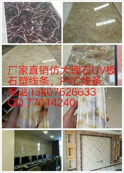 UV仿大理石板适用范围:酒店、温泉、洗浴、KTV、咖啡厅、机场、医院、商场、高档办公楼等场所的室内外装饰选择优饰建材让您以普通材料的价格,装出高档材料的效果!仿大理石的UV板优点: 1、适用于多种异形表面,如罗马柱、壁炉的、旋转楼梯内外侧等复杂、异形的表面; 2、重量较石材轻:因均用涂经复杂工艺制作而成,其重量不足天然石材的十分之一; 3、健康环保,经久耐用:选用顶级涂装材料制作而成,健康环保;经专用材料进行表面处理,经久耐用; 4、形象毕真,表现力强:虽属人工仿制,但优秀的仿制技术会令成品具有天然大理石的纹理、色彩,美观大方,几无人为痕迹;实际效果以实物小样为准。仿大理石的铝塑板优点: 1、颜色多样,平滑性好,重量轻,强度高,隔热,隔音。 2、抗冲击力、可塑性强,易加工。抗腐蚀性能力强,耐候性佳,易清洁维护,防水防火性高。 3、但铝塑板表面不耐磨,搬运时面子要合起来,呈“一”字型平抬,不能磨损。两者相对比,还是仿大理石的UV板要好一些,也看着更真实些。