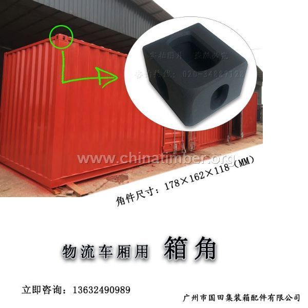 物流车厢用箱角 产品类别:集装箱配件 产品名称:物流车厢箱角 产品符合标准:ISO-1161国际标准 材质:专用铸钢 规格: 178×162×118(mm) 重量:10.8-11KG/个