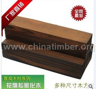 深度炭化木,炭化木,深度炭化木价格,深度炭化木厂家,炭化木规格,碳化木 碳化木即炭化木 炭化木是经过炭化处理的木材,炭化,炭字下是火,顾名思义,必须满足无水,高温的条件,为保护木材强度,控制炭化过程,必须有保护介质。户外使用炭化木必须满足200度左右炭化温度的要求,炭化木分为表面炭化木和深度炭化木。表面炭化木:是用氧焊枪烧烤,使木材表面具有一层很薄的炭化层,对木材性能的改变可以类比木材的油漆,但可以突显表面凹凸的木纹,产生立体效果。应用方面集中在工艺品、装修材料和水族罐制品。也称为工艺炭化木、炭烧木深度炭化木:也称为完全炭化木、同质炭化木。是经过200度左右的高温炭化技术处理的木材,由于其营养成分被破坏,使其具有较好的防腐防虫功能,由于其吸水官能团半纤维素被重组,使产品具有较好的物理性能,深度炭化防腐木是真正的绿色环保产品,尽管产品具有防腐防虫性能,却不含任何有害物质,不但提高了木材的使用寿命,而且不会在生产过程中使用过程中以及使用后的废料处理对人体、动物和环境有任何的负面影响。深度炭化木在欧洲有接近十年的使用经验,是禁用CCA防腐木材后的主要换代产品。深度炭化防腐木广泛应用于可墙板、户外地板、厨房装修、桑那房装修、家具等许多方面。但不推荐使用于接触水和土壤的场合。 使其具有较好的防腐防虫功能,由于其吸水官能团半纤维素被重组,使产木材具有较好的物理性能。 深度炭化防腐木源自欧洲,有十年的使用记录.著名的里昂歌剧院就在1997年采用了全炭化防腐木结构。 深度炭化防腐木安全环保。不含任何化学添加剂的完全环保的防腐防虫木材,具有较好的防腐防虫功能。无特殊气味,对联结件、金属件无任何副作用,适用于室内外。 深度炭化防腐木不易吸水,含水率低,是不开裂的木材。 耐潮湿,不易变形。是优秀的防潮木材。 深度炭化防腐木加工性能好,克服产品表面起毛的弊病。经完全脱脂处理,涂布方便。深度炭化防腐木里外颜色一致,泛柔和绢丝样亮泽,纹理变得更清晰。手感温暖。