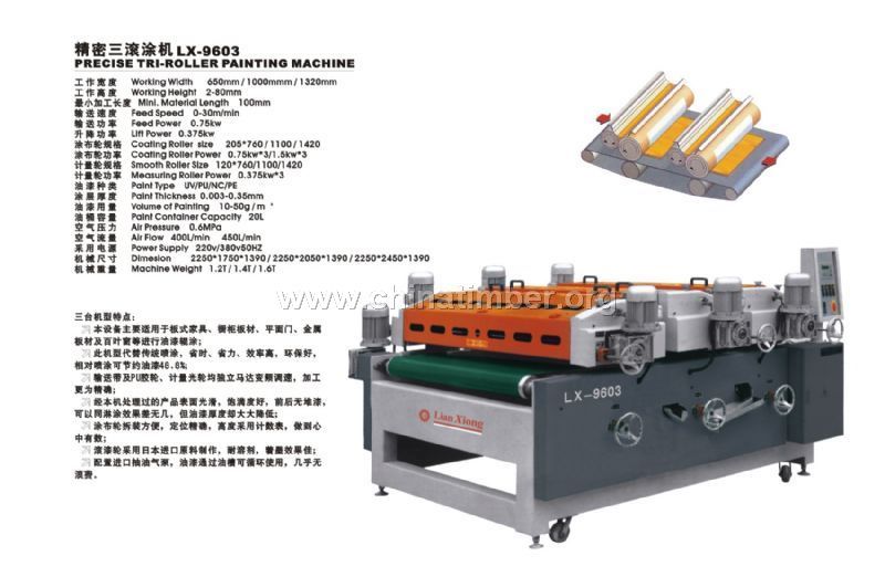 本设备主要适用于板式家具、橱柜板材、平面门、金属板材及百叶窗等进行油漆辊涂;此机型代替传统喷涂,省时、省力、高效率、环保好,相对喷涂可节约油漆48.8%;输送带及PU胶轮、计量光轮均独立马达变频调速,加工更为精确;经本机处理过的产品表面光滑,饱满度好,前后无堆漆,可以同淋涂效果差无几,但油漆厚度却大大降低;涂布轮拆装方便,定位精确,高度采用计数表,做到心中有数;滚漆轮采用日本进口原料制作,耐溶剂,着墨效果佳;配置进口抽油气泵,油漆通过油槽可循环使用,几乎无浪费。