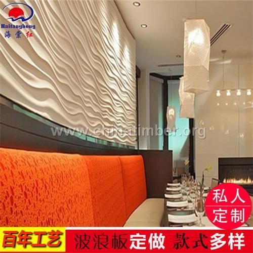 购买须知 1、为了给您提供更好的购物体验,建议您在购买之前请联系客服告知您所需要的款式、尺寸、材质、地址等信息,以免我们给您提供的产品不是您所需要的。 2、由于该产品为定制产品,不同款式、不同要求的价格也是不相同的,在未与客服沟通直接下单的我们将不予发货,因此给您造成的困扰,我们深表歉意,我们还请您能够配合我们的工作。 3、亲爱的买家,我们的商品图片均为实物拍摄,我们也尽量提供给您详细的商品介绍,商品拍摄因为受到天气、光线、拍摄技术显示效果等诸多因素影响,可能会存在一定的色差,这是无法避免的,不属于质量问题,以实物为准,相信实物会更加令您满意。 波浪板是一种新型时尚艺术室内装饰板材。本饰材主要应用于宾馆、会所、家居装饰、度假村、商场、豪宅、别墅等装饰工程,特别适合于设计门庭、玄关、背景墙、电视墙、廊柱、吧台、门、吊顶、展架。可代替天然木皮、贴面板等。波浪板目前主要有直波纹、水波纹、冲浪纹、金甲纹、纺织纹、雪花纹等几十种花纹造型,表面效果有纯白板、贴金银、珠光板、星光板、裂纹漆板、仿石等近三十种效果。造型优美、工艺精细、结构均匀、立体感强、绿色环保、时尚高贵的特性深受广大消费者的喜爱。同时可根据客户需求,订做不同图案、颜色、造型。1、产品规格:标准常规尺寸:1220mm(宽)*2440mm(长)*15mm(厚),外形尺寸、厚度、材料种类等均根据客户要求定制。材料厚度可选择5mm、9mm、12mm、15mm、18mm、21mm、25mm等 2、产品材质:中纤板(MDF)。产品材质也可根据客户要求选择高密度板、三聚氰胺板、实木板、环保竹木板等。 3、产品花纹:海棠红有1000多种花纹图案供客户选择,也可根据客户要求来图订做花纹。 4、产品颜色:1)喷漆、2)贴金银箔、3)贴木皮、4)吸塑PVC等。海棠红色样丰富,也可根据客户提供的色卡喷涂。 5、防潮处理:产品表面及侧面经喷漆,具有极好的防潮效果;产品背面,可根据客户需要选择加贴防潮三聚氰胺膜或双面喷漆。PVC胶膜优点:永不变黄、不褪色、表面极度光滑、图纹极度清晰逼真、图纹种类繁多、防潮效果极佳,可长期放在水中浸泡。 6、产品特殊要求:有倒圆、加厚边框。可根据客户特殊要求制作。 7、其它特点:产品表面平整、色泽光润、耐变黄性好、异味少、防潮、防变形、性价比高等。 8、使用范围:广泛应用于各种住宅、别墅、酒店、会所、商场、写字楼等室内装饰工程之中,并可配套于门业、厨柜、家具,还可用作屏风隔断、壁画,更可取代传统的天花板,营造出高档优雅、个性别具、立体感极强的商住休闲空间。 产品材料特性: 1、中纤板(MDF,Medium Density fiberboard):是中密度纤维板的简称,中纤板以木纤维为 主要材料,通过纤维分离、成型、干燥、高压等工序制成。特点是内部结构匀称、机械加工性能 好、易于雕刻及饶成各种型面、形状的部件。 2、E1高密度板(HDF):是高密度纤维板的简称,它兼容了中纤板的所有特点,是以木质纤维或其它 植物纤维为原料,施加脲醛树脂,或其它合成树脂在加热加压的条件下压制成的一种板材。其内 部组织结构细密、表面平滑,在环境温、湿度变化时,尺寸稳定性好,容易进行表面装饰处理。 3、实木(Solid Wood):即天然木材,一般需要经过裁切,烘干等处理后才能被应用于通花制造中。 4、环保型竹木指接板:分为平压工字结构和侧压工字结构,压合密实结构科学,应力均衡,强度是普通平压侧压竹板的五倍。规格可达2550×1220,厚度有18.0mm、20.0mm、22.0mm、25.0mm、35.0mm、