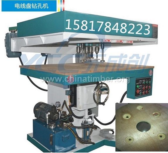 电线盘钻孔机 多头钻孔机 电缆盘加工机械 电线轴生产机械 工作台尺寸working table size 1200X900MM 最大加工深度max.processing depth 50MM 最大钻孔直径 max.boring diameter 100MM 钻轴数 amount of speed 8pcs 转速 rotary speed 3800r/min 电机功率 motor power 3kw*3 本机床适合实木板、胶合板、密度板、软木板等材料多头开孔.适合电线盘挖孔,液压动力,工作时平稳高效,台面升降速度可根据材料硬度调节,孔的中心距可以灵活调节。