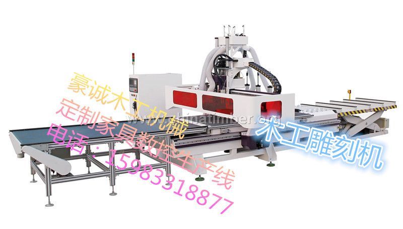 将自动上料、优化开料、打孔、开槽、自动下料完美结合于一体,工序无间断,实现效率产出大化,强大的兼容性可与多种拆单软件无缝对接;采用模块式设计,可以选择:单主轴 数控钻包、双主轴 数控钻包、三主轴、圆盘刀库自动换刀主轴、圆盘刀库自动换刀主轴 数控钻包五种模块单元;采用200x250厚壁大方管T形结构,回火或震动矢效处理,进口五面体金属加工中心进行进行高精度铣削加工;采用侧挂式,单边3个法兰滑块设计结构,运行平稳,齿条导轨全防尘设计结构,导轨采用分段式结构,导轨更换无需专业人员,更方便;进口数控系统,性能稳定,操作简单普通人经过简单培训即可完成操作,无需专业知识;采用双层中空真空吸附台面,可吸附不同尺寸的板材,最小开料板件可达25mm;采用四方向、六动作板材自动定位系统,板材定位更快更准,匹配板材上料到位自动检测系统,可有效防止板材在上料过程中可能出现的各种意外情况;整机专利设计结构,配备独有的上料及除尘机构,可彻底解决上料带“尘”弊病,可真正实现无人干预连续工作;匹配中央智能除尘系统,可保证各个环节和部位的颗粒废料得到有效的清理和收集,可有效保证开料工作的连续性;配备中央自动润滑系统,设置每隔一段时间自动注油,确保机器高效运行;全自动的上料、下料、除尘、定位系统,可有效降低人工定员、工作强度,提高生产效率,降低生产成本,提高产品的标准化程度;