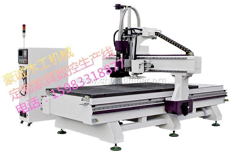1325重型盘式换刀木工加工中心特点: 采用盘式刀库,可安装12把不同造型的木工刀具,换刀时间仅需5秒; 采用T型一体结构,超重稳定床身,持久耐用,永不变形; 采用进口9KW自动换刀主轴,功率大、噪音低、故障率低,耐用;采用进口伺服电机,雕刻精度高;采用进口原装直线导轨,耐磨耐用;进口精密斜齿轮、斜齿,精度高、速度快;原力工业控制电脑,精度高,稳定性好;进口行星减速机,精度高、声音轻、机床寿命长;具有智能自动报警、自动注油、自动对刀等功能,实用方便。 1325重型盘式换刀木工加工中心适用行业:本机型采用T型一体结构,超重稳定床身,非常适用与实木门、板式家具、橱柜门、移门软包等木工行业。家具行业:板式家具、橱柜、移门、软包、办公家具,木门;木制品:音箱、游戏机柜、电脑桌、缝纫机台、乐器; 板材加工:绝缘件、塑料化工件;PCB;动车内体、保龄球轨道;抗倍特板、环氧树脂、ABS、PP、PE等碳化混合物;装饰业:亚克力、PVC、密度板、有机玻璃、塑料,以及铜铝等软金属板材的镂铣切割加工