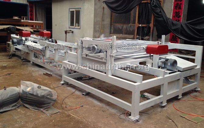 技术参数/Technical parameter: 产品名称: SBJ2500型全自动纵横四边锯 Product name: SBJ2500 type full automatic vertical and horizontal saw 最大锯切尺寸: 1220mmx2440mm Maximum sawing dimension: 1220mmx2440mm 最大锯切厚度: 60mm Maximum sawing thickness: 60mm 锯片轴直径: 25mm Saw shaft diameter: 25mm 锯切电机功率: 5.5kw/4台 Saw cutting motor power: 5.5kw/4台 最大锯片直径: 300mm saw blade diameter: 300mm 外形尺寸: 11000x4300x1200mm Outline dimension: 11000x4300x1200mm 重量: 6300kg Weight: 6300kg 产品介绍/Product introduction: 1 该自动锯由红外线定位部分、预装板设备、纵锯小车、纵锯小车压紧结构、纵锯小车链条传送设备、纵切锯头、横锯架、横锯小车、横切锯头、横锯小车链条传送设备、自动堆垛装置等组成。 2 整个自动锯动作由PLC控制,实现锯切与堆垛的自动化,节约人工 3 该自动锯由红外线监控,准确,避免浪费,而且锯出来的木板比较光滑,效果好。 4 锯边机带有除尘器除尘效果好,整机各处出尘点集中,能过强力排尘。 5 采用高精度耐磨导轨,锯边精度高,班产量可达3000-4000张,大大提高生产效率,增加利润 5 供应各种型号的四边锯,可根据客户要求指定定做。 1. the whole automatic saw action by the PLC control, realize sawing and stacking automation, saving manual 2. the automatic saw by infrared monitoring, accurate, avoid waste, and saw the board is relatively smooth, good results. 3.sawing machine with good dedusting efficiency, the dust everywhere concentrated can have strong dust. 4. high precision wear-resistant guide rail, high precision cutting edge, class production up to 3000-4000 Zhang, greatly improve production efficiency, according to customer requirements specified custom.
