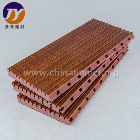 槽木吸音板的产品特点: 1、科技产业——多种材质根据声学原理,合理配合,具有出色的降噪吸音性能,对中、高频吸音效果尤佳。 2、艺术产品——既有天然木质纹理,古朴自然;亦有体现现代节奏的明快亮丽的风格,产品的装饰性极佳,可根据需要饰以天然木纹、图案等多种装饰效果,提供良好的视觉享受。 3、环保产品——所有材料符合国家环保标准,甲醛含量极低,产品还具有天然木质的芳香,公司还可根据客户需要订做E0级零甲醛木质吸声板。 4、安全防火——具有槽木吸音板最高的防火等级B1。这点己通过国家权威部门检测通过。 5、防霉防潮——吸音板的基材全部采用经过特殊处理的高密度防霉防潮板,以确保产品的防霉防潮性能。 6、安装简易——标准化模块设计,采用插槽、龙骨结构,安装简便、快捷。 7、工业生产——改变传统建筑材料粗放型生产,用全自动计算机控制设备,大规模标准化生产,即提高生产能力,也能保证产品质量。 二 槽木吸音板型号 2面1槽:59/5 60/4 3面2槽 40/3 38.5/4 4面3槽:28/4 29/3 6面5槽 18/3 17/4 8面7槽:13/3 14/2 三 槽木吸音板基材普通基材 环保基材 防火B1级基材 防火A级基材三、槽孔吸音板的结构 基 材——景音槽孔吸音板采用高密度的防霉防潮板做成,厚度为15mm或18mm。亦可根据用户的要求使用其他厚度或性能的密度板基材。 饰 面——三聚氰胺饰面,请按公司色卡选择,真木皮饰面,可按客户要求选择木皮及油漆颜色。吸音薄毡——颜色为黑色,粘贴在吸音板背面,具防火吸音性能。板条宽度——128mm或按照客户要求订做。板条长度——最长2440mm或按客户要求订做。允许公差——宽度为0.1MM,长度为2MM。拼 版——板条长边根据实际需要做成90度角的企口和凹口来拼接四 吸音系数 五 安装方法 1、安装前的存放要求存放“景音”木质吸音板的仓库要求密封和防潮,在安装“景音”木质吸音板前,必须先将包装箱打开至少达48小时以上,以便产品达到与安装场所相一致环境特性。 2、安装场所要求安装场所必须干燥并且至少安装前24小时要达到规定的温湿标准,安装场所要求的最低温度为15度,安装后的最大温度变化值要控制在40—60%范围内。 3、墙面用吸音板安装方法(1)、先将轻钢龙骨安装到墙面。(2)、贴墙轻钢龙骨的立面尺寸18X26X3000mm长,分隔间距为60cm。(3)、将尺寸为45X38X5mm的扣片安装在龙骨和吸音板之间。(4)、覆盖吸音板背面的玻璃棉:厚度30—50mm、密度32kg每立方米、宽度与长度为600X1200mm。 4、注意事项(墙面)(1)、龙骨架格栅之间推荐选用的间距为60CM。(2)、多块“景音”木质吸音板在板与板组合安装时,板头与板头之间至少要留出3MM的空隙。(3)、如果吸音板从地面开始按横式安装,则长面的凹口要朝下安装并用扣片锁紧,一块接一块再将其他吸音板安装上去。