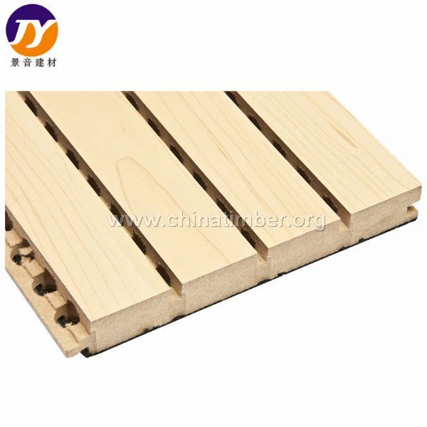 槽木吸音板的产品特点: 1、科技产业——多种材质根据声学原理,合理配合,具有出色的降噪吸音性能,对中、高频吸音效果尤佳。 2、艺术产品——既有天然木质纹理,古朴自然;亦有体现现代节奏的明快亮丽的风格,产品的装饰性极佳,可根据需要饰以天然木纹、图案等多种装饰效果,提供良好的视觉享受。 3、环保产品——所有材料符合国家环保标准,甲醛含量极低,产品还具有天然木质的芳香,公司还可根据客户需要订做E0级零甲醛木质吸声板。 4、安全防火——具有槽木吸音板最高的防火等级B1。这点己通过国家权威部门检测通过。 5、防霉防潮——吸音板的基材全部采用经过特殊处理的高密度防霉防潮板,以确保产品的防霉防潮性能。 6、安装简易——标准化模块设计,采用插槽、龙骨结构,安装简便、快捷。 7、工业生产——改变传统建筑材料粗放型生产,用全自动计算机控制设备,大规模标准化生产,即提高生产能力,也能保证产品质量。 二 槽木吸音板型号 2面1槽:59/5 60/4 3面2槽 40/3 38.5/4 4面3槽:28/4 29/3 6面5槽 18/3 17/4 8面7槽:13/3 14/2 三 槽木吸音板基材普通基材 环保基材 防火B1级基材 防火A级基材三、槽孔吸音板的结构 基 材——景音槽孔吸音板采用高密度的防霉防潮板做成,厚度为15mm或18mm。亦可根据用户的要求使用其他厚度或性能的密度板基材。 饰 面——三聚氰胺饰面,请按公司色卡选择,真木皮饰面,可按客户要求选择木皮及油漆颜色。吸音薄毡——颜色为黑色,粘贴在吸音板背面,具防火吸音性能。板条宽度——128mm或按照客户要求订做。板条长度——最长2440mm或按客户要求订做。允许公差——宽度为0.1MM,长度为2MM。拼 版——板条长边根据实际需要做成90度角的企口和凹口来拼接四 吸音系数 五 安装方法 1、安装前的存放要求存放“景音”木质吸音板的仓库要求密封和防潮,在安装“景音”木质吸音板前,必须先将包装箱打开至少达48小时以上,以便产品达到与安装场所相一致环境特性。 2、安装场所要求安装场所必须干燥并且至少安装前24小时要达到规定的温湿标准,安装场所要求的最低温度为15度,安装后的最大温度变化值要控制在40—60%范围内。 3、墙面用吸音板安装方法(1)、先将轻钢龙骨安装到墙面。(2)、贴墙轻钢龙骨的立面尺寸18X26X3000mm长,分隔间距为60cm。(3)、将尺寸为45X38X5mm的扣片安装在龙骨和吸音板之间。(4)、覆盖吸音板背面的玻璃棉:厚度30—50mm、密度32kg每立方米、宽度与长度为600X1200mm。 4、注意事项(墙面)(1)、龙骨架格栅之间推荐选用的间距为60CM。(2)、多块“景音”木质吸音板在板与板组合安装时,板头与板头之间至少要留出3MM的空隙。(3)、如果吸音板从地面开始按横式安装,则长面的凹口要朝下安装并用扣片锁紧,一块接一块再将其他吸音板安装上去。