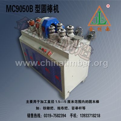 金利森机械新上市圆棒机MC9050B、MC9060B型圆棒机主要用于木材切削圆棒面的设计,也可用于塑料、硬橡胶、木质合成纤维等材质的圆棒切削,但除木材外对于其他材质的圆棒切削其调整难度相比木材大很多,该设备加工质量好生产效率高,广泛应用于各种工艺加工,家具厂,木器厂等木材加工行业,加工锹把,拖布把、笤帚把、晾衣杆等多种直径的圆木棒。 参数名称 参数主电机功率 3kw 送给电机功率 0.75kw 蜗轮减速机 1:40 主轴转速 4000转/min 送料速度 4米/min 加工直径 15-60(mm)最短加工长度 300mm 机床外形尺寸 750*550*960(mm)整机净重 320kg