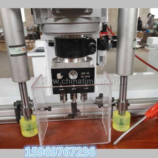 功能介绍: 主要用于家具门板的合页钻孔,如衣柜门板、橱柜门、办公家具门板等。一次性可把合页眼及两边的固定螺丝眼钻完,可以大大的提高家具的生产效率!精确的扣尺及气动压料装置更加提高了产品的精确度,使钻出来的合页眼达到完美的准。采用脚踏开关控制操作既安全又省力。可分段独立操作又可一次性完成五个合页的钻孔。 1、机床孔距调整采用C型气动锁紧,灵活、准确、强劲有力; 2、机床采用高硬度圆柱导轨,调整不同孔距方便、快捷; 3、该机设有校刀装置,准确到位,可保证钻孔深度的需要; 4、能一次性加工一块或两块门的铰链孔,生产效率极高 机身刚性好,结构紧凑,噪音低。采用高品质气动元件,操作轻便,随机器配有台湾产钻包,性能可靠,价格适中。非常适合中于小批量生产的橱柜厂