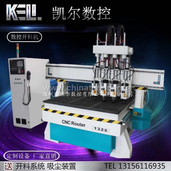 四工序数控开料机是一款经济型多功数控设备,四工序数控开料机有四个主轴,在生产板式家具的时候四个主轴都可以实现打孔处理,其中两个主轴为大功率主轴专门负责开槽和下料,另外两个主轴专门用来打孔。这样通常板式家具生产中遇到的孔位大小都可处理了。同时四工序数控开料机还能很好的用在橱柜门的生产上,四个主轴都可以用来做门型,当遇到门型需要的刀型在四个及四个以下的,都可以气动换刀进行加工。目前四工序使用的厂家比较少,性价比相对而言不是很高,但在四工序开料机在综合应用方面是比较好的。 机器配置 主轴电机:6KW风冷主轴*1,3.5KW风冷主轴*2。 伺服电机:进口伺服电机。 控制系统:维宏NCSTUDIO和DSP手柄 系统。 齿条:德国亨利安精密斜齿。 导轨:进口直线方轨。 性能参数 型号:Z4。 主轴行程:X轴 1300mm,Y轴 2500mm,Z轴 200mm。 有效加工尺寸:1220mm*2440mm 加工精度:±0.05mm。 重复定位精度:±0.02mm。 空行速度:6000mm/min。 加工速度:2000mm/min。 工作电压:AC 380V/50Hz。 外形尺寸:2300mm*3300mm*2400mm。 整机重量:2600Kg。 整机特性 ■ 本机是一款复合型多功能机器,在板式家具生产中打孔,四个主轴都可以用来打孔,打孔的效率上比三工序开料机稍微高点。 ■ 四工序在做橱柜门也是得心应手,四个主轴都可以用来雕刻,在四个及一下的橱柜门型可气动换刀加工完成。 适应行业 适合材料:密度板,刨花板,生态板,PVC,亚克力,实木,等非金属材料。 适合行业:板式家具生产,橱柜门生产,木板雕刻,电路板雕刻,镂铣,乐器