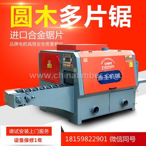 此多片锯称为多功能圆木多片锯:一,圆木可以自动分中,无需对准锯片,自动落中,二,可以全部开片(锯自然宽板片),三,可以中间取一个方,四,可以中间取两个方,五,可换夹套,做出不一样的板材,六:长料短料都可以锯。七:喷水装置在机器后方部位,换锯片夹套方便简单,省时又省力。八:关键部位人性化设计,真正做到防水、防尘、易保养,不损害每一片锯片。九:使用超薄小尺寸锯片,负荷小,省材省电。十:可加工杨木,松木,桉木,杉木,青钢木等多种硬杂木,是木工机械多片锯的首选!