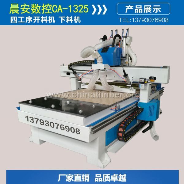 CA-1325四工序雕刻机,橱柜门雕刻机,衣柜门雕刻机 实木门雕刻机 雕刻机性能特点 1.多个机头可同时工作,提高做工效率。 2.采用龙门式结构,导轨支撑面稳定,齿条传动方式,传动平稳,保证长时间高速运行不变形,不抖动。 3.采用直线导轨,Y轴采用双电机驱动,承重冗余大,寿命长。采用双齿条传,操作更简单,设计更具人性化。 4.多种软件兼容,可兼容type3/Artcam/Castmate/精雕,文泰等多种设计制作软件。 适用行业 ◆木工行业:古典红木家具产品的加工。 ◆广告行业:广告标牌、标识制作、压克力切割、吸塑制模、多种材料广告装饰产品的制作。 ◆其他行业:可以雕刻各种影雕、浮雕,广泛应用于工艺礼品行业。 ◆可应用于:铝板切割行业、铝板、铝塑板、铝蜂窝板、铝型材、3D镂花工艺、波浪板生产、各类人造板材异形开料、LED、霓虹灯槽形字面切割,吸塑灯箱模具制作。亚克力、铜板、PVC板、人造石,MDF板等各类板材加工。 产品参数 行程 X行程Y行程Z行程 1300*2500m*200mm 平台尺寸 1580x3100mm 精度 加工精度 ±0.05mm 结构 台面结构 ABS X Y Z结构 X、Y齿条,Z丝杠 主轴功率 4.5KW 主轴转速 0-24000R/MIN 运行模式 步进 工作电压 380V 净重 1350KG 毛重 1450KG 运行指令 G代码,F/S命令兼容 操作系统 维宏