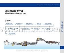 小径木锯断生产线 生产流程——原木横向输送机——阶梯步机上木机——原木纵向输送机——测量光幕——原木纵向输送机——横向输送加二级V型分根——原木纵向输送机——横向爬坡上木机——原木横截锯——原木纵向输送机