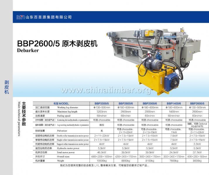 采用无卡旋切机的旋切原理,液压驱动进给机构,可以快速、高效的完成把原木除去树皮并修圆的工作。一台剥皮机可供应两台旋切机正常工作,省去了原来的人工铲树皮及修圆工序,节省人力成本5-6人。