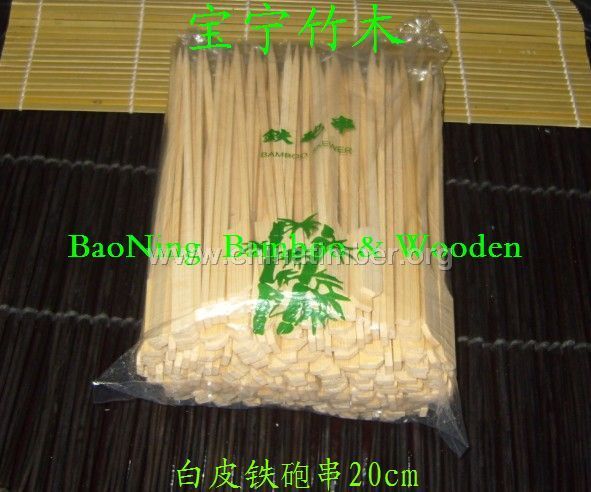宝宁竹木生产的铁砲串球拍串产品:青皮铁砲串,白皮铁砲串,球拍串、烫字铁砲串、烫字球拍串等。青皮铁砲串是以优质桂竹为原料,采用新鲜加工法,去除毛竹竹表皮,保持竹子表皮隐青的技术生产,保持了产品的固有韧性,经成片、成型、抛光、品质检验、高温消毒、包装之程序加工而成。白皮铁炮串产品规格:9cm、12cm、13.5cm、15cm、18cm、21cm、24cm等。并可按照客户的需要在产品上烙字,如企业LOGO、制造商名称等。所有产品都严格按照行业的标准执行生产,并符合出口相关国家地区的相关标注,于2003年已出口日本、欧美等地区。